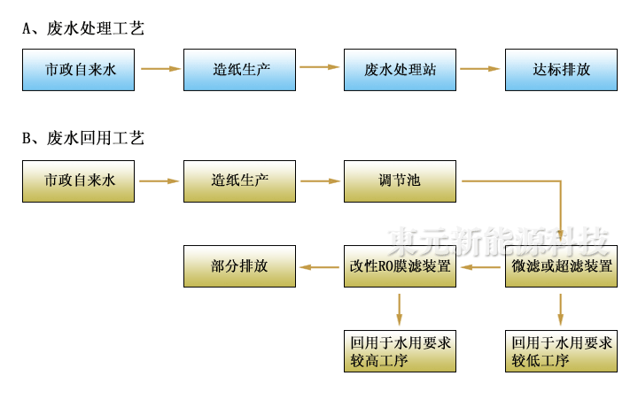 造紙綜合排放廢水回用前與回用后系統(tǒng)工藝流程示意圖如下: