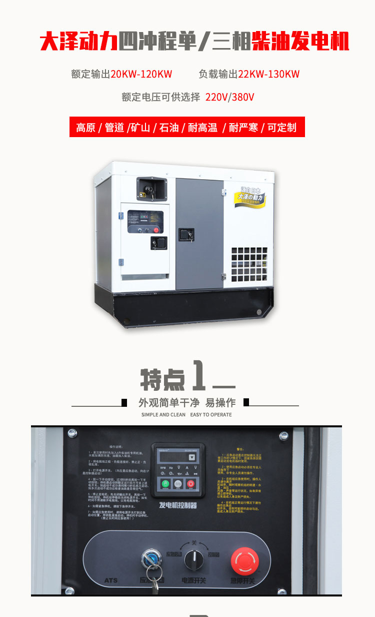 30千瓦靜音柴油發電機尺寸大澤靜音柴油發電機的耗流量比柴油的耗流量要低,而且柴油發電機的運用時刻也比柴油發電機的運用時刻長,柴油發電機能夠24小時不斷的運用,柴油發電機每天的運用時刻不能大于10小時。....