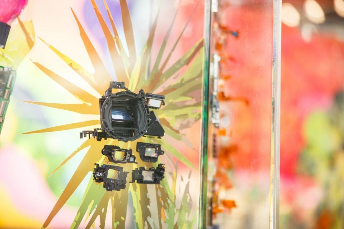在創作過程中,康蕾老師表示:“我的第一臺相機就是佳能相機,以往都是用相機去拍攝和記錄外部的世界,這是第一次有機會近距離的了解相機的內部結構,有了全新的認識角度,發現整個佳能相機本身就是一件藝術品,里邊的各種金屬機械零件和反光折射的鏡片特別的精致精美,材料質感不同,顏色和形狀也都不一樣,帶來很多創作靈感 。 ”