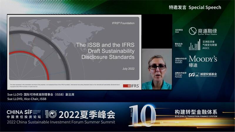 隨后,國際可持續準則理事會(ISSB)副主席Sue LLOYD做了特邀發言。她介紹,ISSB由國際財務報告準則(IFRS)基金會在2021年第26屆聯合國氣候變化大會上發起,旨在制定統一的可持續發展報告準則。她分享了ISSB近期發布的兩份可持續披露準則文件征求意見稿的主要內容,即《國際財務報告可持續披露準則第1號——可持續相關財務信息披露一般要求(征求意見稿)》和《國際財務報告可持續披露準則第2號——氣候相關披露(征求意見稿)》,并呼吁大家在七月底之前積極提供反饋。