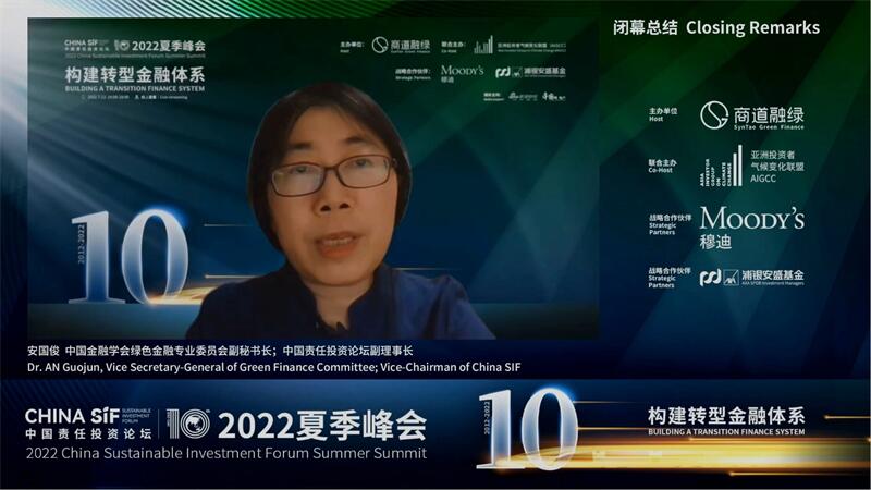 最后,中國金融學會綠色金融專業委員會副秘書長、China SIF副理事長安國俊博士做了總結發言。她指出,要充分發揮綠色金融和轉型金融的作用,首先要加強投資、金融、財稅等工具創新,激勵社會資本投入綠色低碳產業及轉型技術領域;完善綠色金融與綠色財政、產業政策協調發展的“1+N”政策體系,推進綠色金融、轉型金融、可持續金融、氣候投融資、影響力協同發展。引導綠色基金ESG投資、資本向善的趨勢和體系的完善。同時也要逐步完善與轉型金融相關的行業標準、風險定價機制等“基礎設施”框架的搭建,培育綠色基金、碳中和基金等綠色投資者,將資管產品創新與社會責任承擔有效協同,為雙碳目標構建我國綠色金融與轉型金融協同發展的體系。