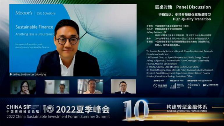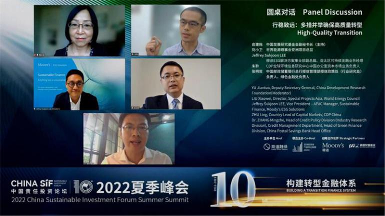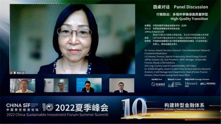 夏季峰會第二場圓桌對話主題為“多措并舉確保高質量轉型”。圓桌對話由中國發展研究基金會副秘書長俞建拖主持,世界能源理事會亞洲特別項目負責人劉小衛、穆迪ESG解決方案事業部副總裁與亞太區可持續金融業務經理Jeffery Sukjoon LEE、CDP全球環境信息研究中心中國辦公室資本市場業務負責人朱聆、中國郵政儲蓄銀行授信管理部授信政策處(行業研究處)負責人與綠色金融處負責人張明哲作為嘉賓出席,共同探討了可持續金融助力高質量轉型中的挑戰、原因及解決方案。
