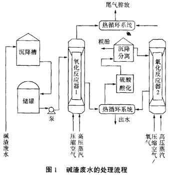 第二級為催化濕式氧化,溫度控制在200℃~300℃之間,壓力控制在5.0MPa左右,空氣或者純氧曝氣,采用γ-Al2O3/CuO作催化劑進行催化濕式氧化。堿渣廢水先經過沉降分離器除油后進入儲罐,然后經泵加壓送至一級緩和濕式氧化反應器,脫除硫化物;如果堿渣廢水中含有可觀的環烷酸和酚,可采用硫酸進行酸化回收,并且調節pH值;料液部分循環逐步進入二級催化濕式氧化反應器,對殘留的酚及其它大部分CODcr進行降解。為維持反應溫度和壓力,套筒式反應塔夾層引入高壓蒸汽調節溫度,內部用空壓機曝氣,維持氧分壓和總的操作壓力。處理過程中的熱量采用熱交換裝置進行回收利用。