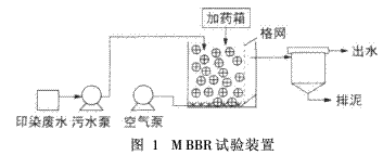 移動床生物膜反應器[1](MBBR)是近年來頗受重視的一種新型高效生物膜廢水處理裝置。在反應器中投加比表面積大、密度略小于1的懸浮填料,微生物附著生長在填料表面形成生物膜,曝氣后處于流化狀態,從而實現對污染物的高效去除。另外,聚二甲基二烯丙基氯化銨(PDMDAAC)在水處理方面有絮凝劑用量少、脫色效果顯著等優點,在水處理領域應用廣泛。因此,本試驗嘗試在MBBR中投加一定量的PDMDAAC,以期提高其對印染廢水的吸附性能,取得較好效果。