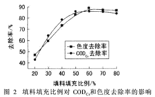 水力停留時間(HRT)取24 h,測定填料填充比例對色度和CODCr去除效果的影響[4],結果如圖2所示。