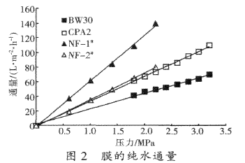 由于印染廢水的組成比較復雜,因而在用膜技術處理印染廢水時,應針對不同印染廢水選擇材料、結構和性能合適的膜。膜材質的選擇主要考慮廢水的pH和染料的種類及鹽含量。另外膜的選擇必須確保膜對印染廢水中色度和COD的有效去除,以達到一定的處理要求。采用膜的純水通量來考察膜的本征特性。納濾和反滲透過程采用的壓力范圍分別為0.6~2.2 MPa和1.8~3.2 MPa,它們的純水通量如圖2所示。