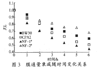 從圖3還可看出,無論反滲透還是納濾,結構更致密的膜通量下降的程度較結構疏松的膜要小得多,說明小分子量物質對膜孔的堵塞可能是造成膜污染的一個重要因素。如6 h后,具有較大膜孔徑的NF-1#膜通量為初始通量的0.45,比反滲透膜的通量下降幅度還大,而相對致密的NF-2#膜通量穩定性則要好得多。對兩種反滲透膜來說,其結果比較也是一樣,即BW30比CPA2膜通量穩定。