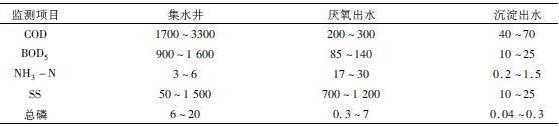 NH3-N 在厭氧出水后升高是由于厭氧反應的過程中,大量的有機氮轉變?yōu)榘钡斐傻摹谋? 可以看出,厭氧對COD 的去除率可以達到90%以上,BOD、氨氮、SS 和總磷等各項指標均可以達到90%以上的去除率,并實現穩(wěn)定達標。