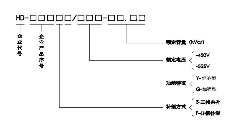HD系列智能式電力電容器的產品型號如下圖,表明產品種類。